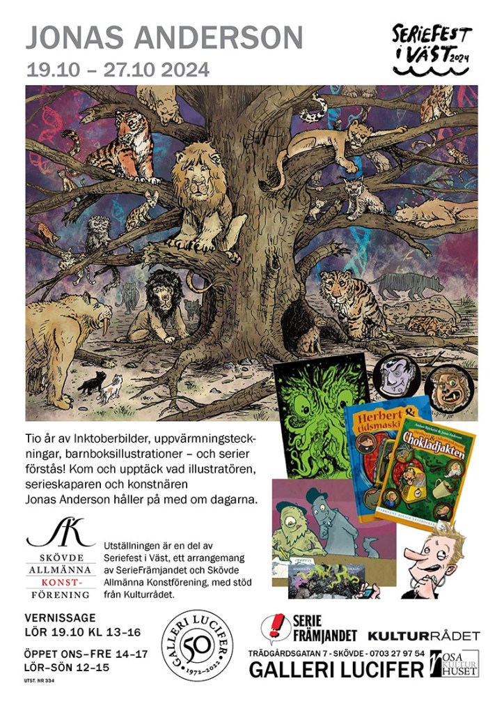 Inspirationskällorna är många, konstnären nämner själv ofta Tove Jansson, ”vars böcker ofta bär ett stråk av melankoli”. Utställningen på Galleri Lucifer visar både fritt måleri och serier. För, som Anneli påpekar:– Jag har liksom en käpphäst som jag alltid vevar med, och det är att serier är bildkonst. En form av. Ingen motsats.