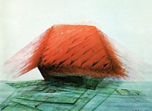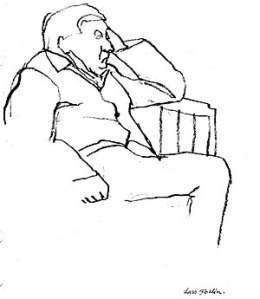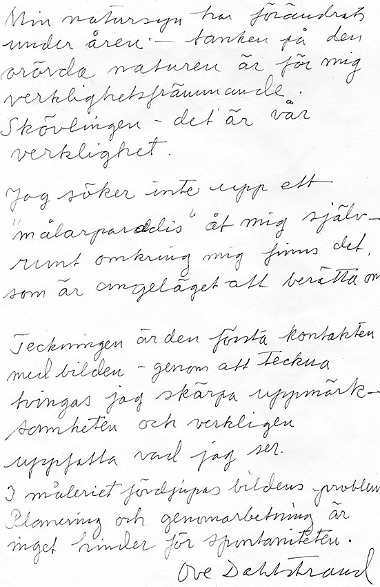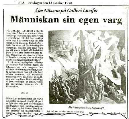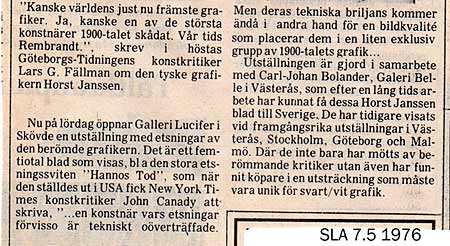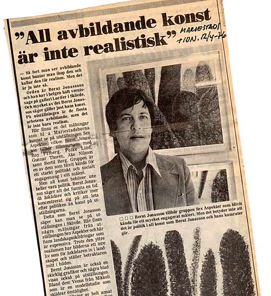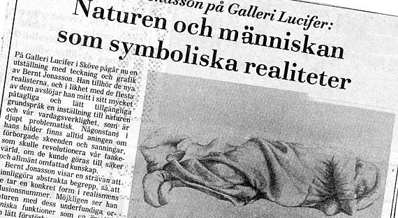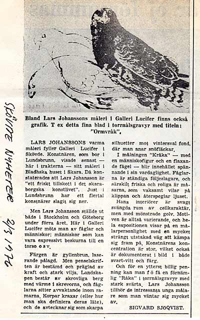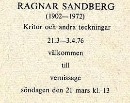 Det var till den här utställningen som Marie-Louise De Geer-Bergenstråhles (Ekman) blöjpaket anlände (se utst.nr 23). Det innehöll tre små målningar ”Måltid I-III” pris 500 kr/st. Ingen var framsynt nog att göra ett fynd. Och jag hade väl inte pengar, som vanligt. Alla gick i retur. Men det blev några teckningar av Bruno Knutman, men de kostade bara 280 kr/st, så de passade väl min kassa bättre. Och så har jag alltid varit svag för svart/vitt.