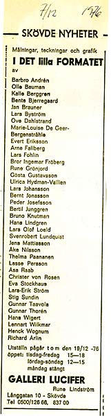 Lisa Andrén, Yngve Berg, Lars Fohlin, Roj Friberg, Axel Fridell, Agneta Göes, Åke Johansson, Bernt Jonasson, Björn Jonson, Lennart Lindholm, Siri Magnus-Lagercrantz, Jens Mattiasson, Åke Nilsson, Åke Pallarp, Torsten Renqvist, Gunnar Thorén, Angela Utbult och Tommy Östmar
