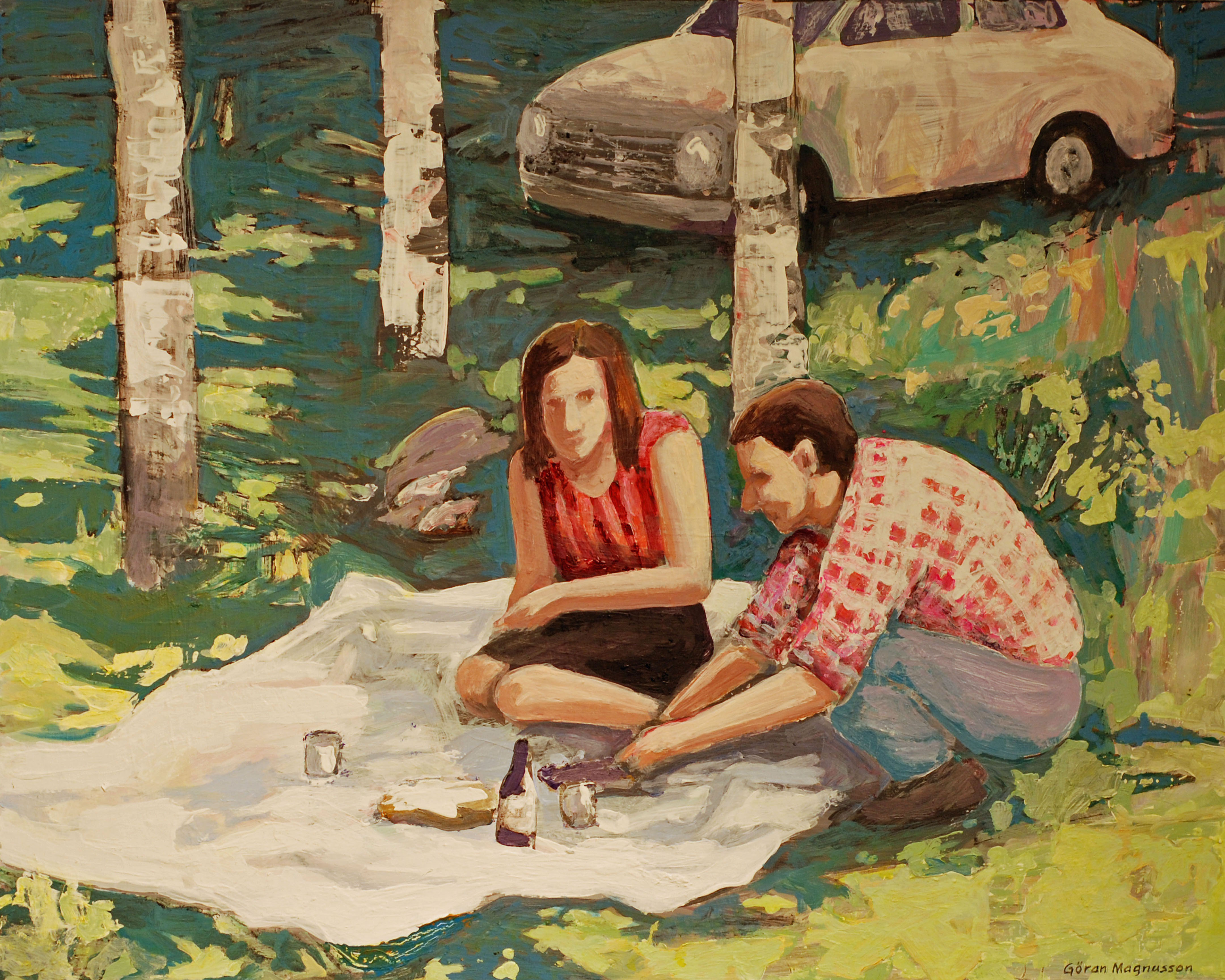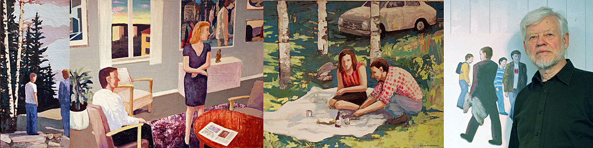 På lördag öppnar en utställning med Göran Magnusson. Han är född och uppvuxen i Skövde, utbildad i Göteborg och bosatt i Ljungstorp sedan i början av 1970-talet. Han har alltid varit intresserad av bilder och inspireras av konst från vitt skilda tidsepoker. Göran såg popkonsten som en befrielse, ett reningsbad. Plötsligt var allt tillåtet! Görans bilder är alltid föreställande, aldrig abstrakta. I början var det mest blyertsteckning sen övergick han till akvarellen. Motivsfären var oftast ödehus som fick liv i ett slags porträttHan såg dock problem med akvarelltekniken för mediet är så omedelbart och svårt att justera. Akrylen passar honom bättre eftersom han gärna arbetar parallellt med flera bilder och stegvis, målar över och ändrar. Det kan ta lång tid innan en bild känns färdig.De senaste åren har byggnader och stadsbilder fått ge vika för människor, ensamma eller tillsammans, som ögonblicksbilder.