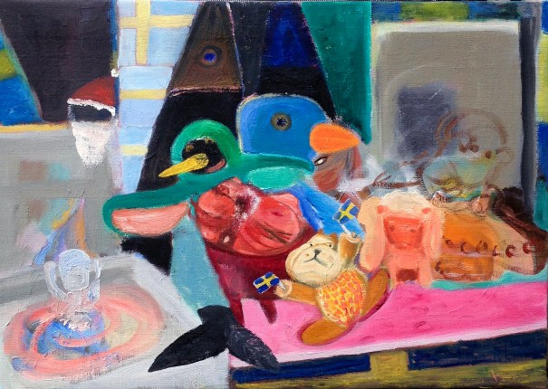 I den här utställningen visar jag bla bilder som jag målat av objekt tillverkade av skrot och gosedjur.