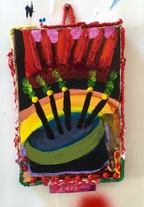 Människan – mig själv? Jag håller bestämt på att skapas om, medan jag ser, till en (något) (möjligtvis) bättre variant. Men han skrämmer mig samtidigt, den mästaren. Jag skrattar högt och det blir jag allvarlig av. Eftertanken kranka blekhet ges starka färger när han målar, gärna på en gammal skåpdörr.