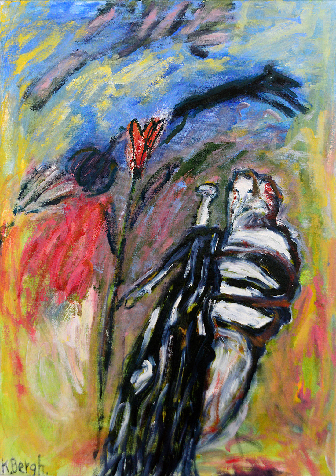 Människan – mig själv? Jag håller bestämt på att skapas om, medan jag ser, till en (något) (möjligtvis) bättre variant. Men han skrämmer mig samtidigt, den mästaren. Jag skrattar högt och det blir jag allvarlig av. Eftertanken kranka blekhet ges starka färger när han målar, gärna på en gammal skåpdörr.